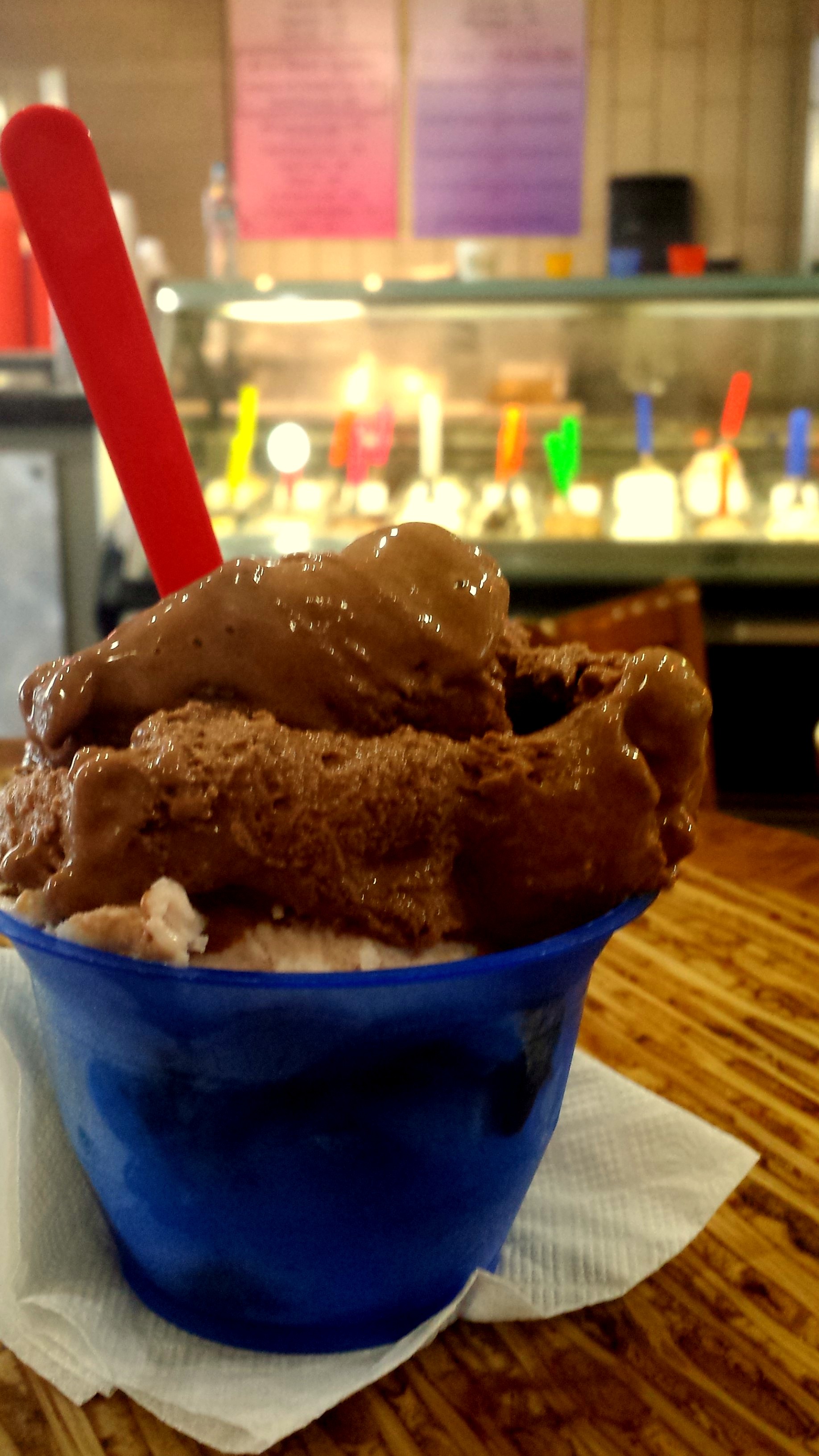 The best aspect of AOF is the creativity of the chef. Every day, she features at least one “Sapore del Giorno,” flavor of the day in Italian. These flavors range from familiar, like Twix Bar, to inventive, like Strawberry Balsamic with Black Pepper. I’ve even seen her serve a pickle sorbet! One of the most surprisingly delicious flavors is her Pear Gorgonzola, it’s just gently tangy from the cheese and sweet from the pears; the light flavors in this mesh so well that, without knowing the name of the gelato, it would be difficult to guess Gorgonzola cheese was an ingredient. On this particular day, I ordered two scoops; Twix and Spumone. Twix was a rich chocolate gelato which felt like eating a cold chocolate cloud, with a ribbon of soft caramel and chunks of Twix swirled in. And the Spumone was a mix of a fresh strawberry gelato, chocolate and the ever-delightful pistachio. The chef has the remarkable ability to concoct gelato with savory flavors and make it taste delicious as if red kidney beans naturally belong in dessert.
